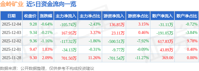 证券之星音讯,到2025年12月4日收盘,金岭矿业(000655)报收于9.28元,跌落0.64%,换手率0.78%,成交量4.66万手,成交额4348.09万元。